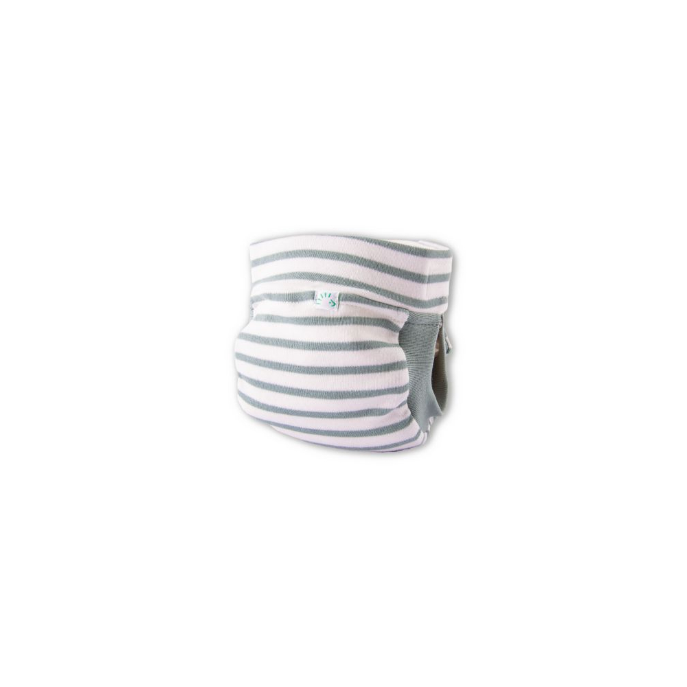 • 1) Außenwindel: Eine Baumwollüberhose mit Klettverschluss (Klett schließt von vorne nach hinten), gibt der Windel die nötige Stabilität. An den Beinen sind angenehm weiche Beinbündchen. Am Bauchbund ist ein Hakenband für die optionale Windelfrei Funktion.